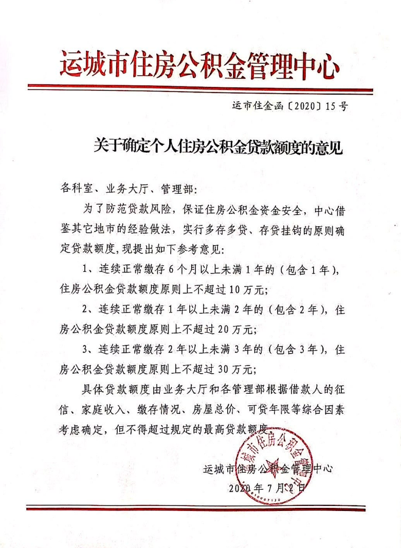2020年7月3日,運城市住房公積金管理中心發布了《關于確定個人住房公積金貸款額度的意見》(運市住金函〔2020〕15號),對住房公積金貸款額度做出了新的規定,具體內容如下: