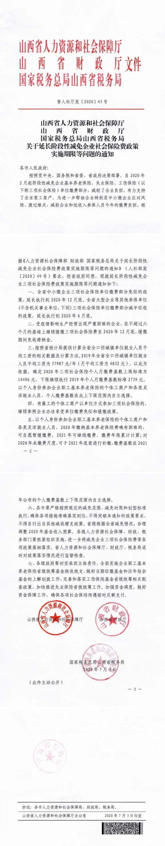 2020年7月3日,山西省人力資源和社會保障廳、山西省財政廳、國家稅務總局山西省稅務局發布了《關于延長階段性減免企業社會保險費政策實施期限等問題的通知》(晉人社廳發[2020]43號),就延長階段性減免企業三項社會保險費政策實施等問題做出了新的通知: